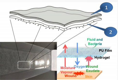 復合化智能型高端醫(yī)用水凝膠敷料,采用紫外光交聯水凝膠合成技術,1 分鐘內讓水凝膠熟成,形成三維立體網絡親水性高分子 ; 制程避免溶劑揮發(fā)及過量能源消耗等環(huán)境污染問題。