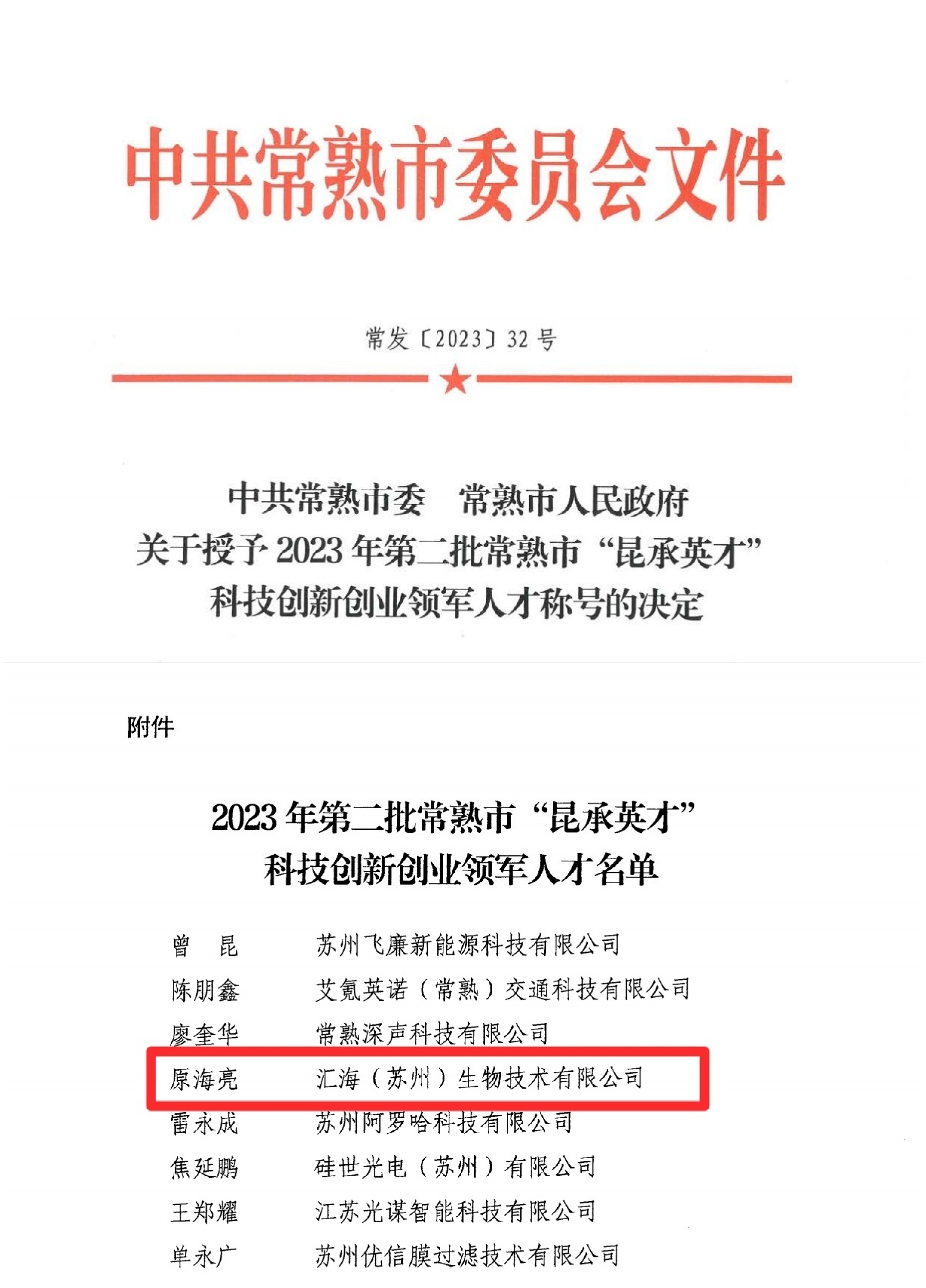 2023年12月29日,第二批常熟市“昆承英才”科技創(chuàng)新創(chuàng)業(yè)領(lǐng)軍人才計劃擬命名人選名單公示。匯海(蘇州)生物技術(shù)有限公司(以下簡稱“匯海生物”)技術(shù)負(fù)責(zé)人原海亮最終成功入選科技創(chuàng)新創(chuàng)業(yè)領(lǐng)軍人才。